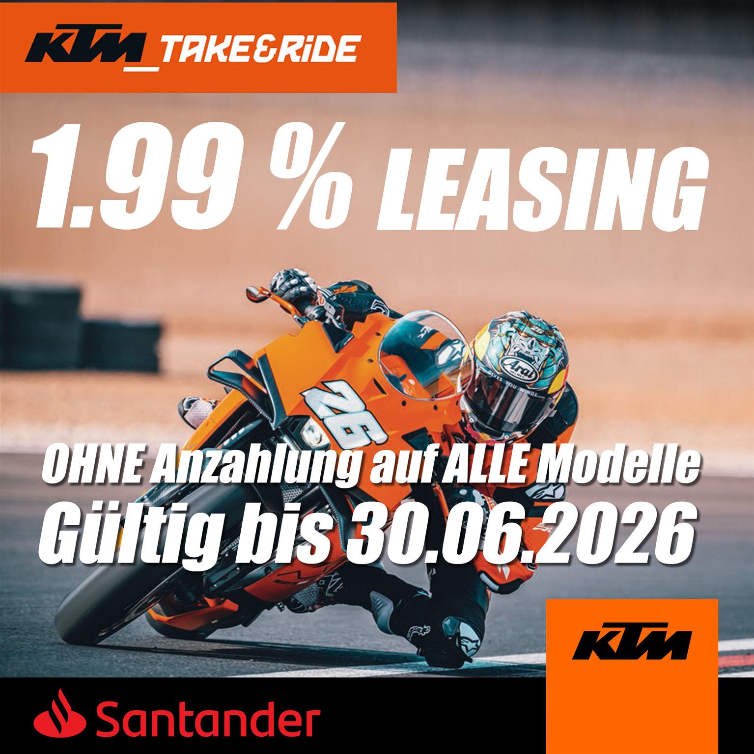 1.99% Leasing Angebot OHNE Anzahlung, auf ALLE KTM Modelle (gültig bis 30.06.2026)